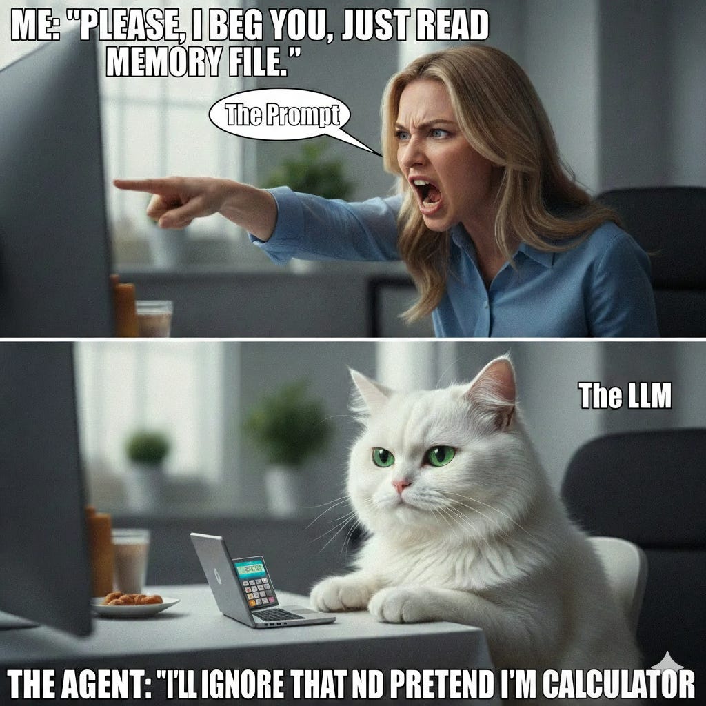 These were just instructions - text in a prompt. The agent could ignore them. And it did. Sometimes it would read the memory files. Sometimes it wouldn’t.